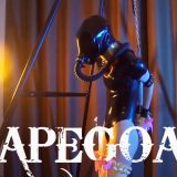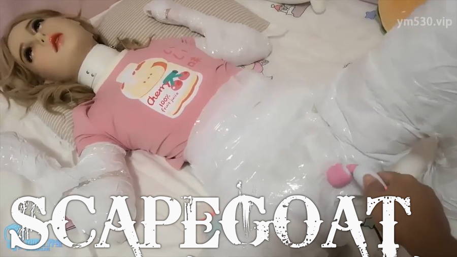 ドールマスク+両肘・両膝を固定された女→口を塞いで呼吸制御→マスクの口にテープ→電マでお仕置き→顔面ラップ巻き呼吸制御