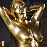次第に銀粉のメッシー感に酔いしれながら顔まで銀粉フェイスに!頭から銀粉をかけられ髪まで全身シルバーの彫像と化した美女は服を脱ぎ、恍惚とした表情でオマンコに指を入れながらオナニーを始める。乳首をいじり、クリトリスを擦り、喘ぎイキをする銀粉美女!